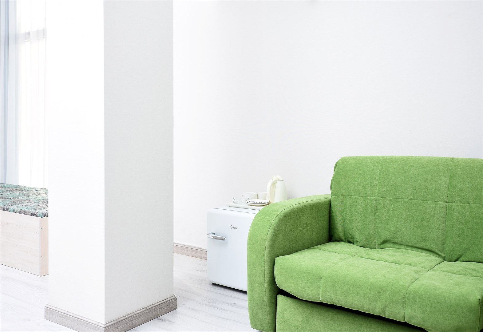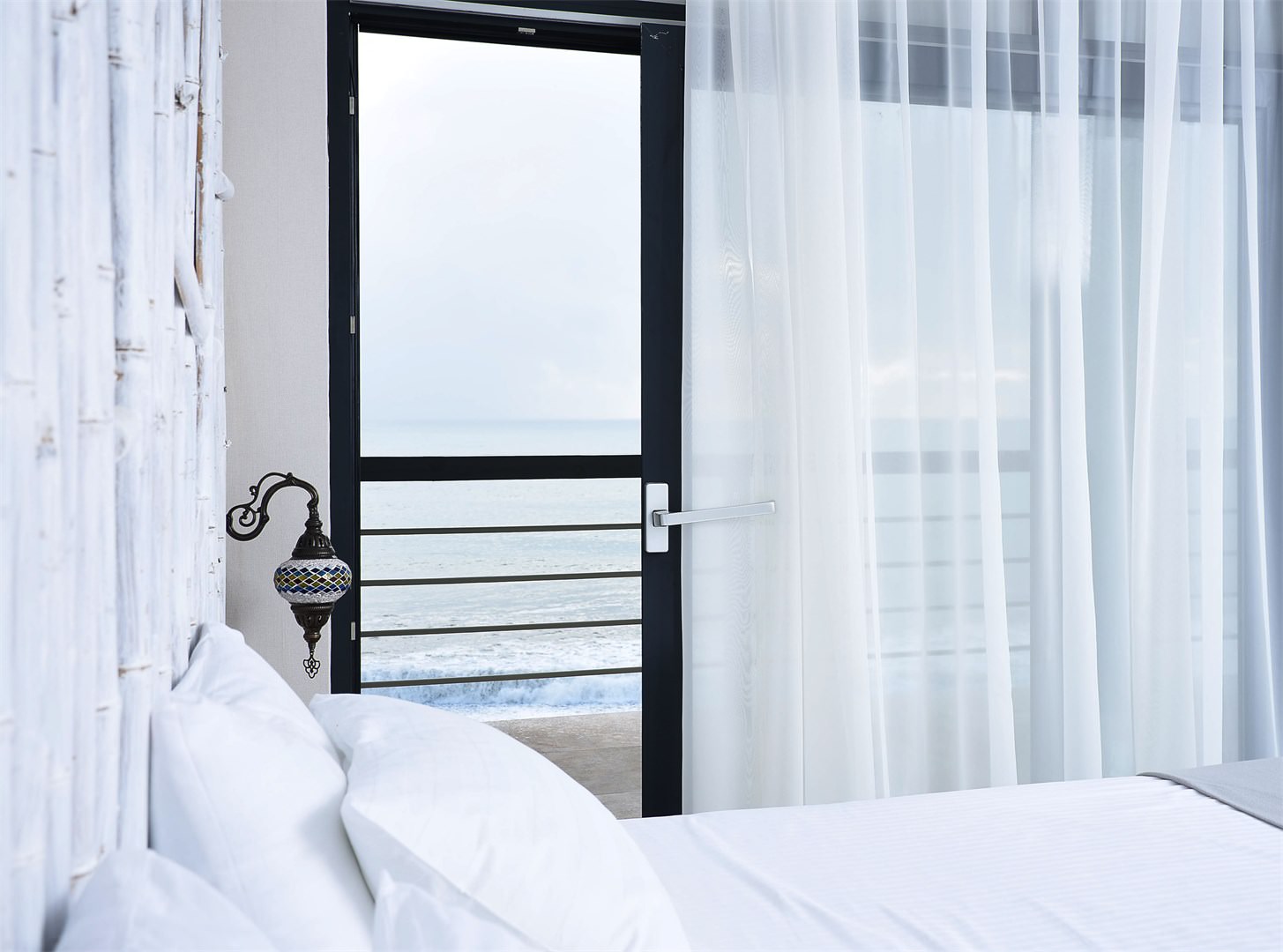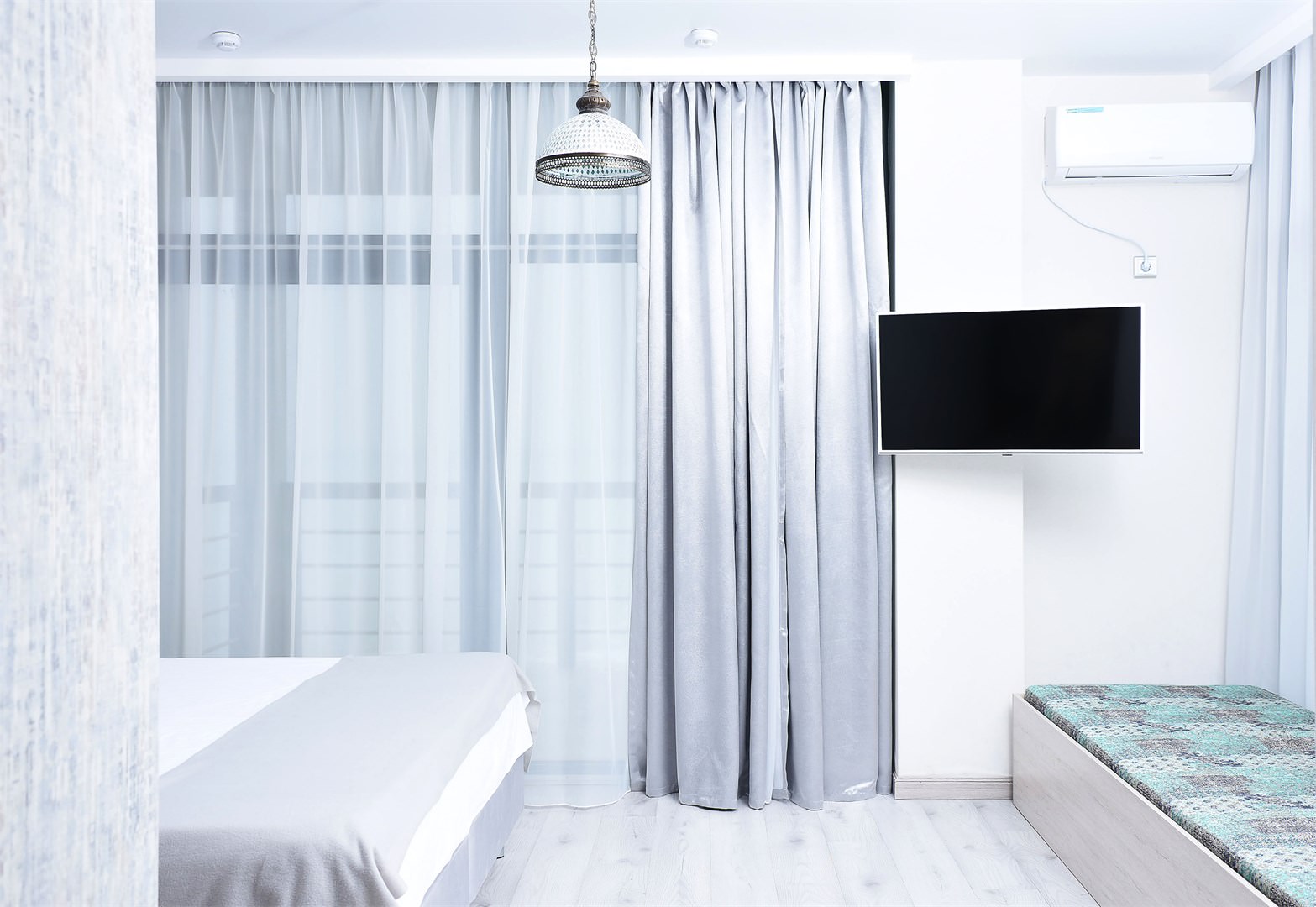 Трехместный номер с двумя раздельными кроватями и диван-кровать, 26 кв. м, максимальная вместимость 3 человека. С выходом на балкон и прямым видом на море. В номере есть все необходимое для проживания LCD-телевизор, кондиционер, бесплатный Wi-Fi, фен, утюг, полотенца, тапочки, одноразовые гигиенические принадлежности, халаты, чайная станция, холодильник. Совмещенный санузел-душевая стойка, гигиенический душ, унитаз.